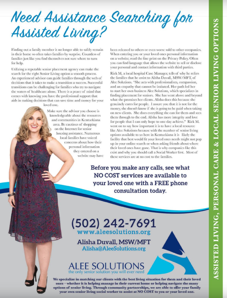 The search for a new home for a senior usually comes in a time of crisis. That can make a confusing process into a stressful and overwhelming ordeal. With such a critical demand for our Making-a-Move services, we wanted to offer something back to the community by matching the need with the best care alternatives for each of our clients. With our reputation of honor and integrity it has given us the ability to partner within our community allowing Alee Solutions to offer this Making-a-Move service FREE. The Kentuckiana retirement industry has joined together to make what is a highly emotional and frustrating time for our clients into a time to feel energized by the loving personalities that care so dearly about the ever aging members of our community. Alee Solutions is here to reduce your anxiety by doing the legwork for you. Now, isn't that cool? So take a moment to catch your breath and hand it over to us.