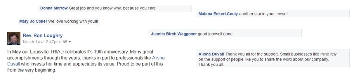 "I cannot say enough in support of our friend Alisha Duvall. Alisha is the founder of Alee Solutions. (www.aleesolutions.org), a company that specializes in helping folks transition through their later years." - Freddie Claypool